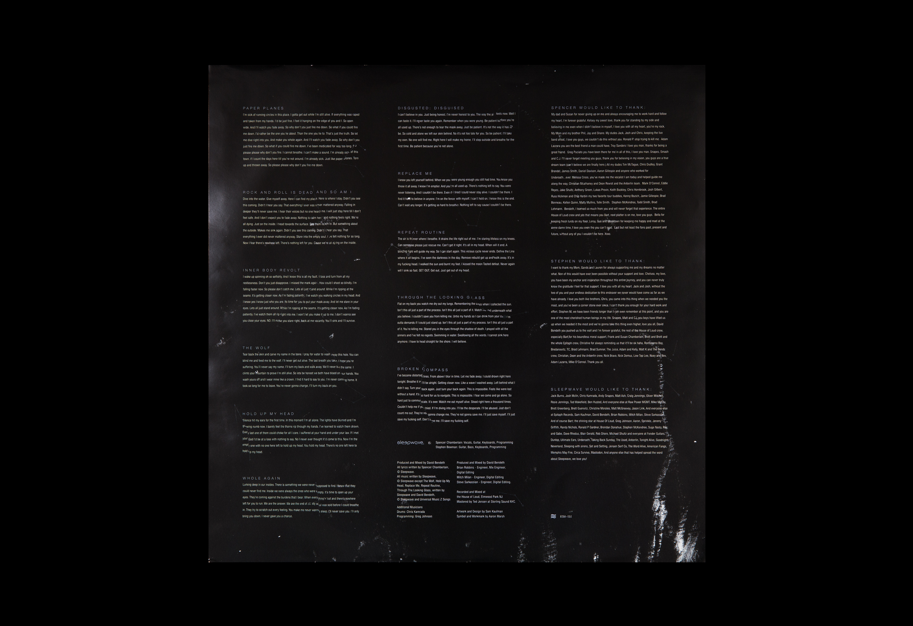 Sleepwave, a band inspired by late 90's grunge and industrial music, it felt appropriate to convey a mood rather than an obvious narrative. A few things were already in place when I was brought in to work on the project; the band had their wordmark, symbol, and they wanted both to be on the cover. The album's title track presents themes of being personally and emotionally lost. I created several original mixed media paintings with these themes in mind with the intention of making the viewer feel like their were in a semi-concious dream state or a "sleepwave". Star constellation illustrations were also used throughout. When a sailor finds themselves lost at sea with a broken compass, they rely on the night sky to find their way through dark.